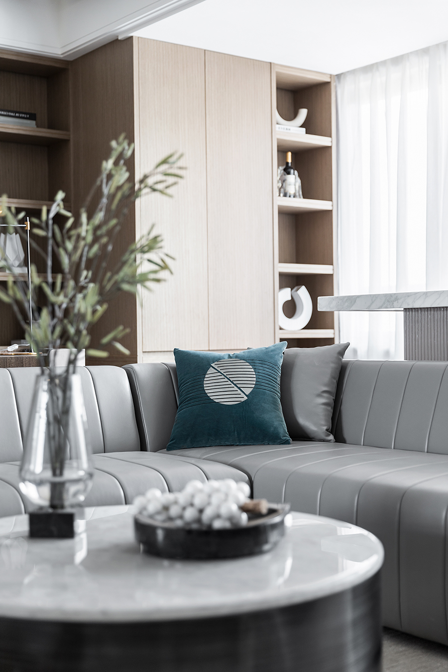 为增加空间的层次性,设计师还利用墙体镜面与沙发的载体,在同一视线上形成呼应,而材质上刚与柔的不同属性,在较量中相互凸显,无分伯仲,且缺一不可。
