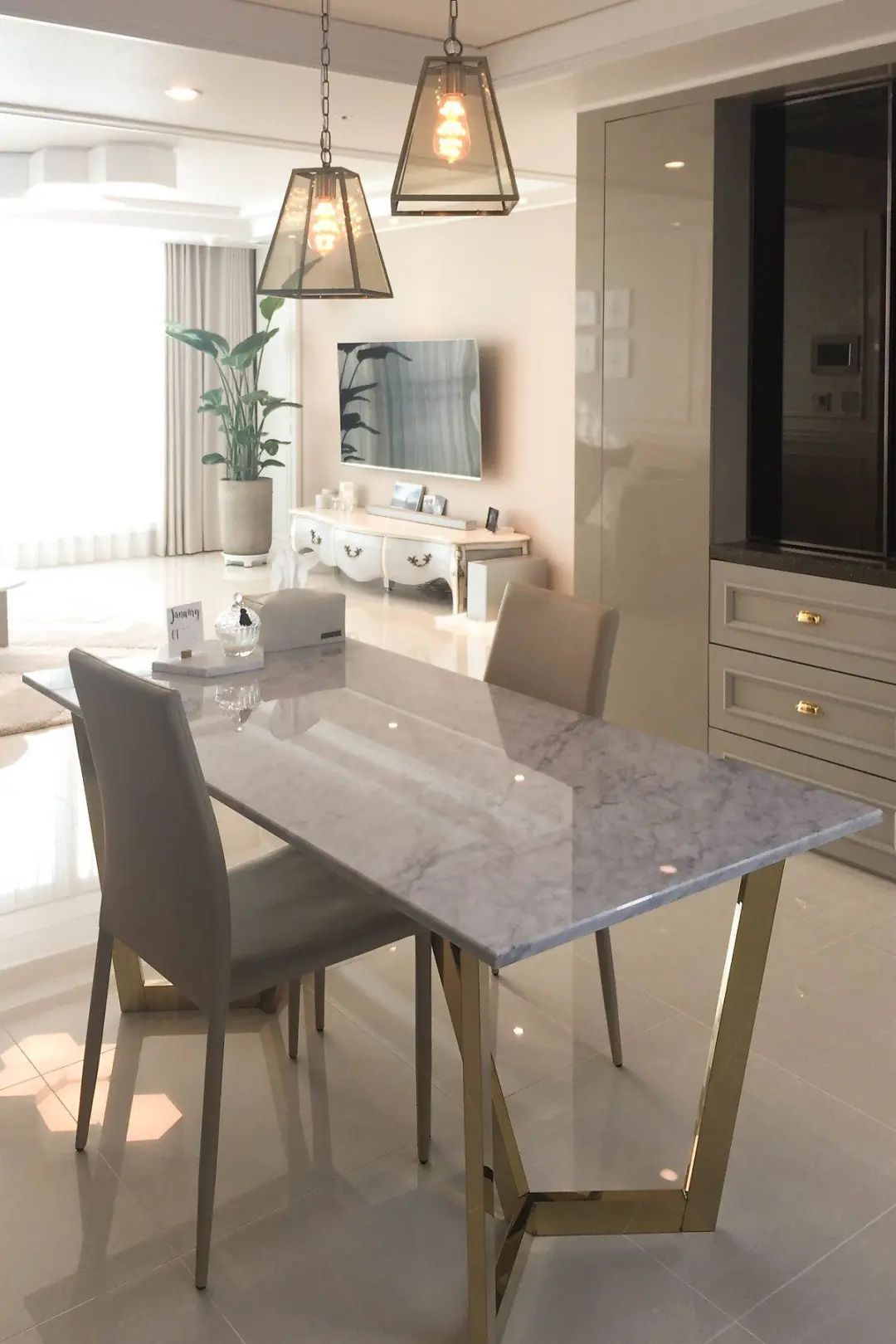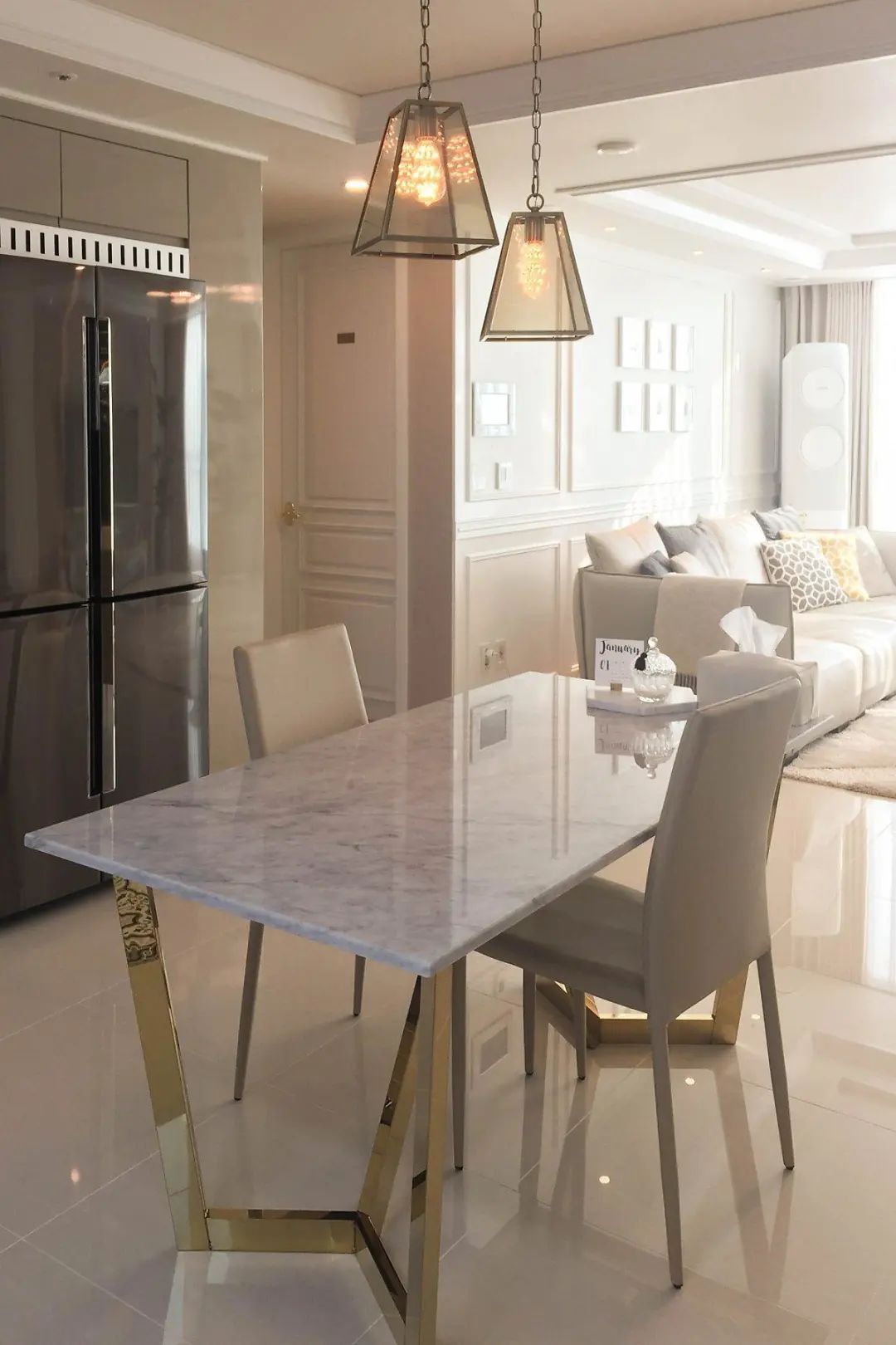 客厅的右手边就是他们家的开放式的餐厨区,2个功能区打通结合后,显得家里像有200平那么宽敞。