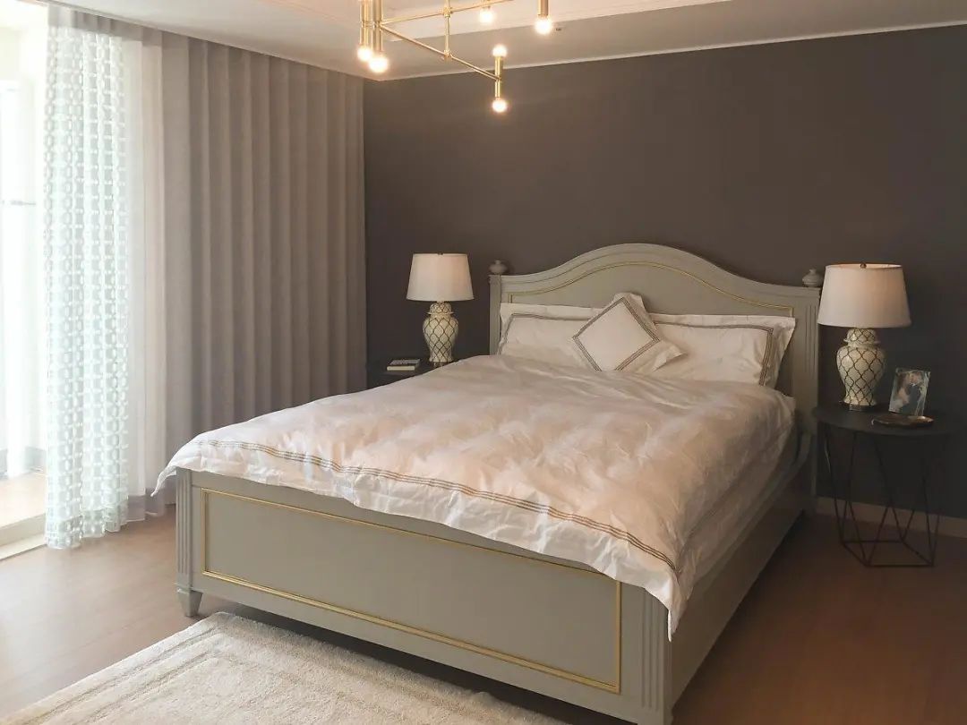 堂哥夫妻俩的主卧,也应着整体法式的风格,床、床头灯、窗帘都在烘托着法式的浪漫。