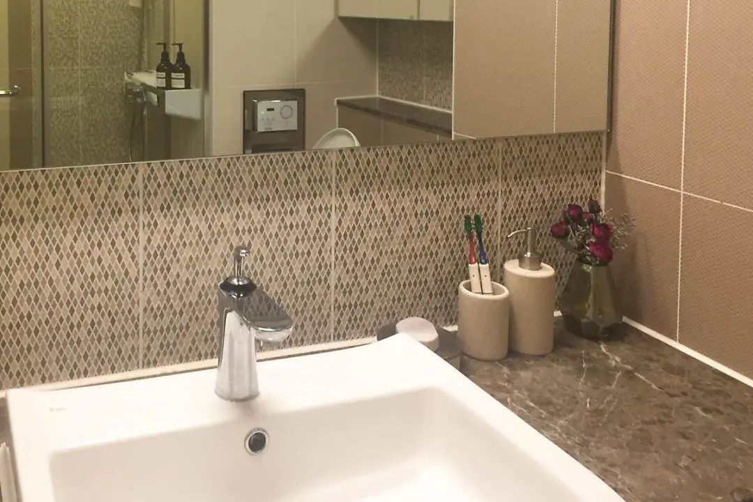 主卫内的空间不算大,但却应了那句麻雀虽小五脏俱全,洗漱台上有镜面柜收纳洗漱用品,马桶上方又装有吊柜做储物,淋浴房则在花洒下就近安装搁架放洗浴用品,普通的收纳设计却也最实用!