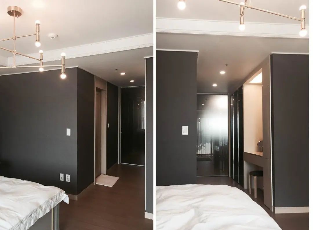 主卧室的空间还是比较大的,套间的设计,所以不仅房间内有主卫,堂哥还特地给她媳妇在走廊设计了一个梳妆台,打造出步入式化妆间的感觉。