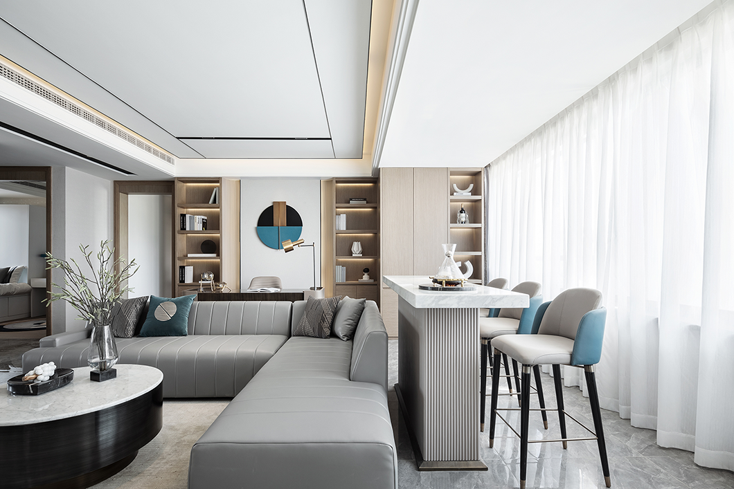 木褐色的柜体、雾霾蓝的吧椅、灰色的沙发等,构成了本案莫兰迪体系的阵营,以低饱和度的“高冷”姿态,重塑匠心独运的艺术品格。