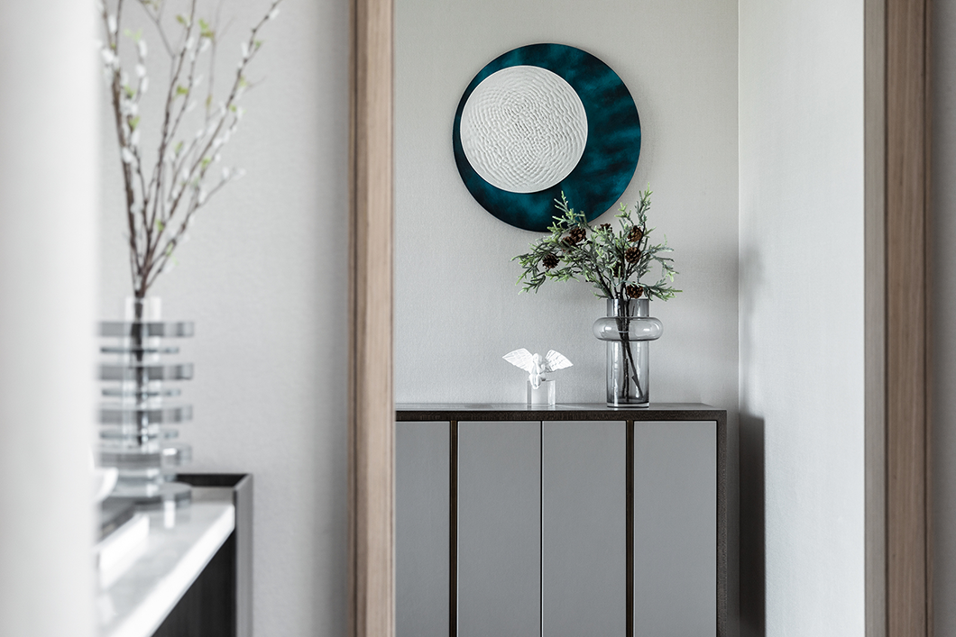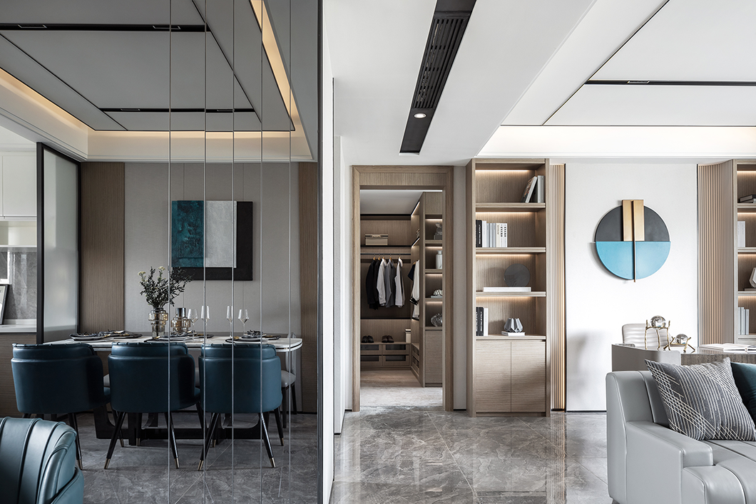 为增加空间的层次性,设计师还利用墙体镜面与沙发的载体,在同一视线上形成呼应,而材质上刚与柔的不同属性,在较量中相互凸显,无分伯仲,且缺一不可。
