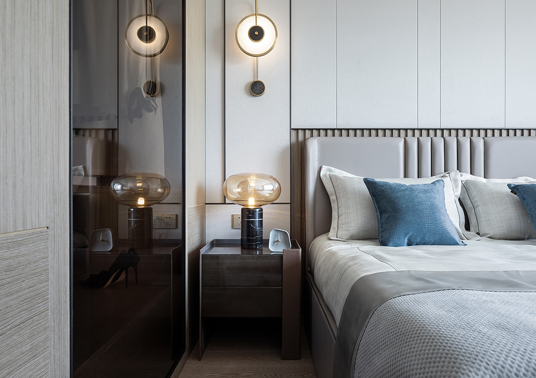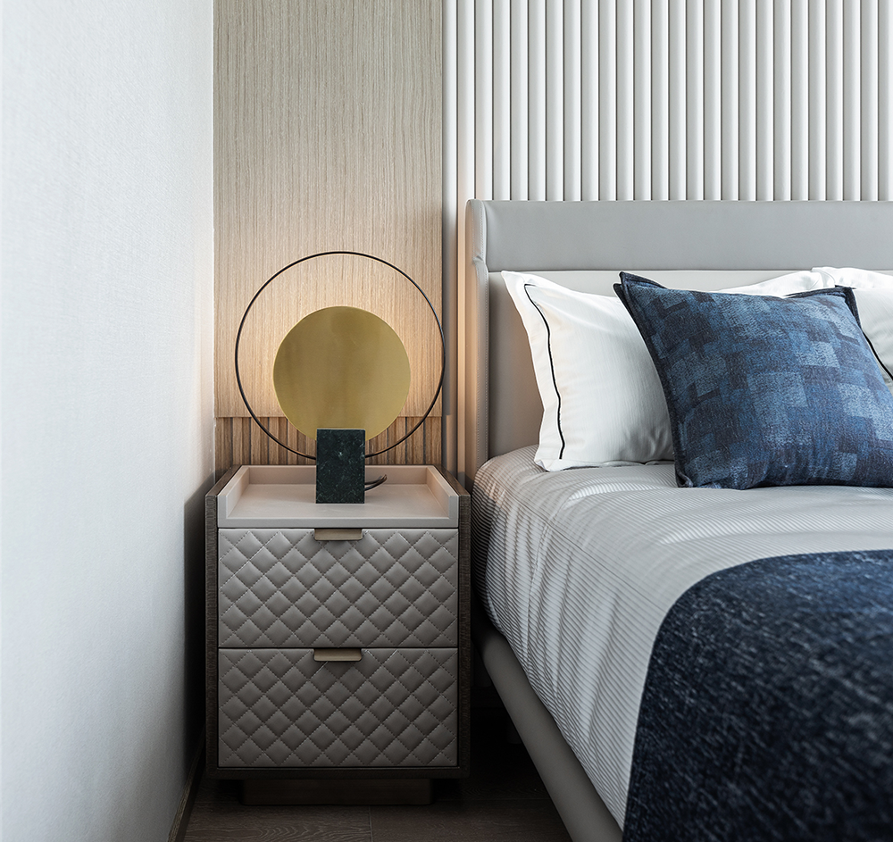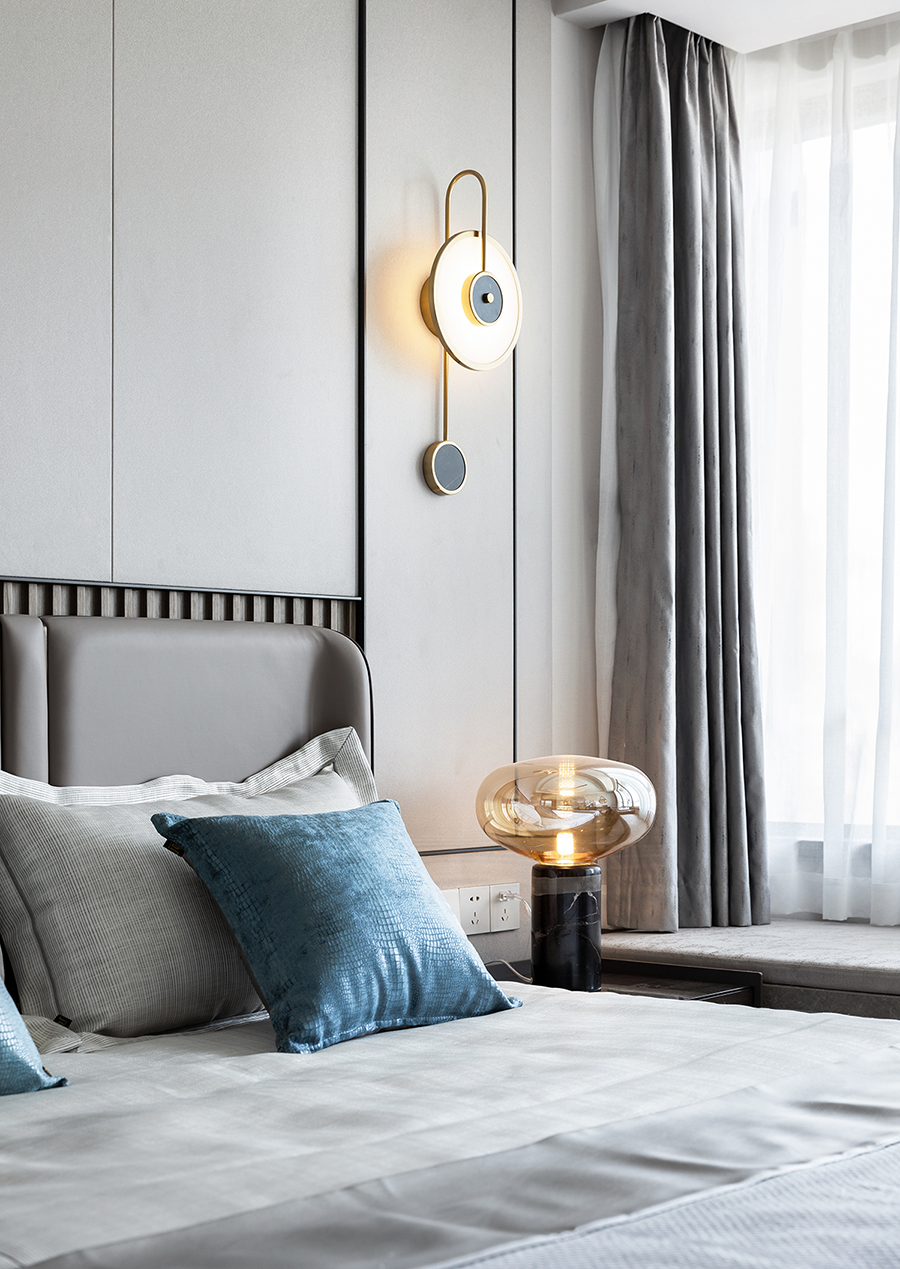 设计师又将其融合在以灰色大理石为底的感光环境中,打破过于寂静的氛围,质感中带着丝丝神秘,提升着空间的轻奢感受。